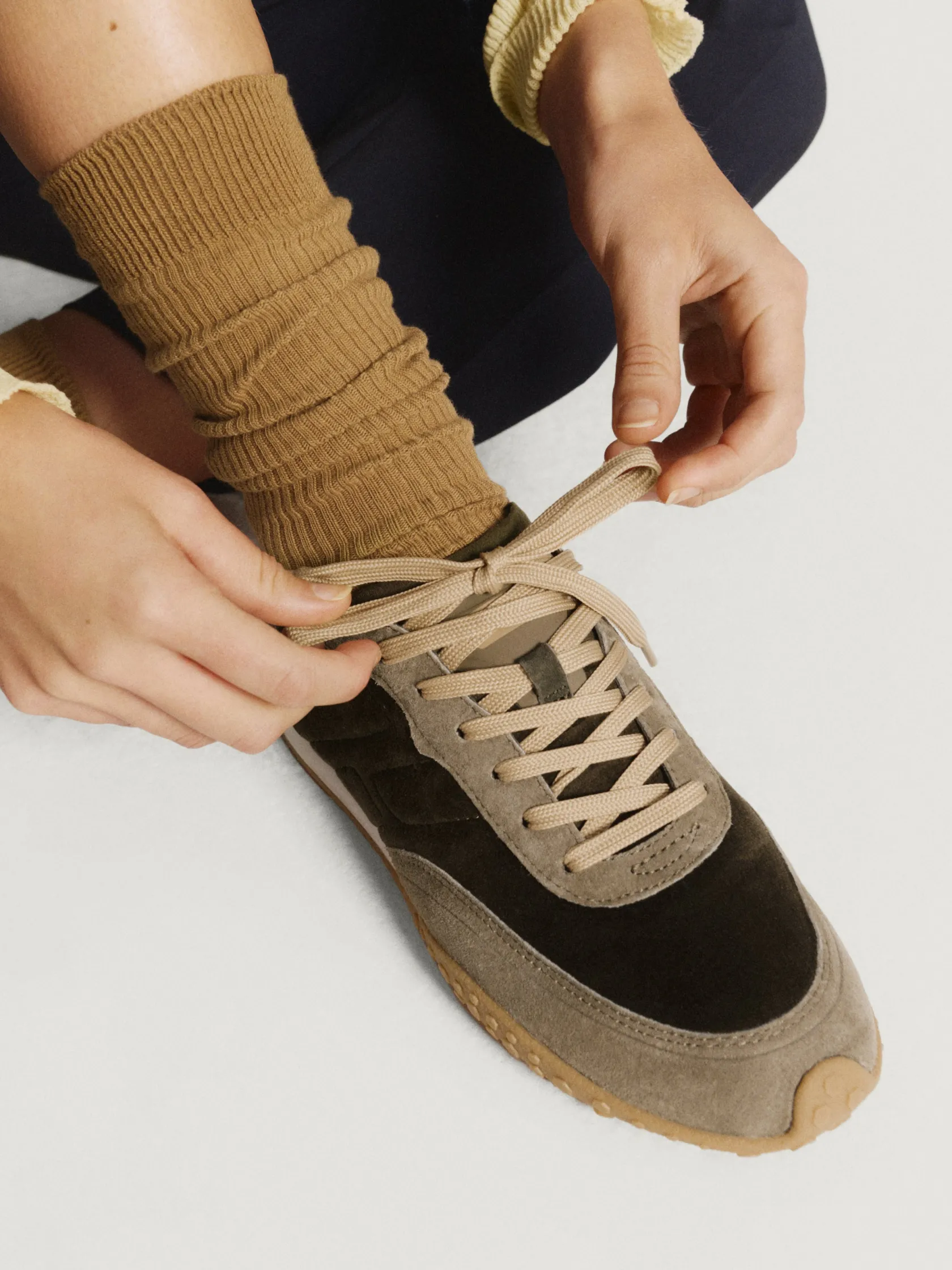Die HAWK Sneaker aus der BIRD Kollektion fangen die Essenz von Herbst und Frühling mit ihrem Design ein. Mit einer Ästhetik, die die klassische sportliche Form mit einem Hauch von Raffinesse verbindet, zeichnen sie sich durch ihre klaren Linien und das flache Profil aus. Das Gleichgewicht zwischen Leder und Stoff sorgt für besonderen Komfort. Die Waldgrüntöne und Wildlederdetails harmonieren mit der gelben Gummisohle, die subtil auf Fußballschuhe verweist, jedoch mit einem modernen Twist. Ideal, um sie mit einem Jeansrock oder weiten Hosen zu kombinieren.