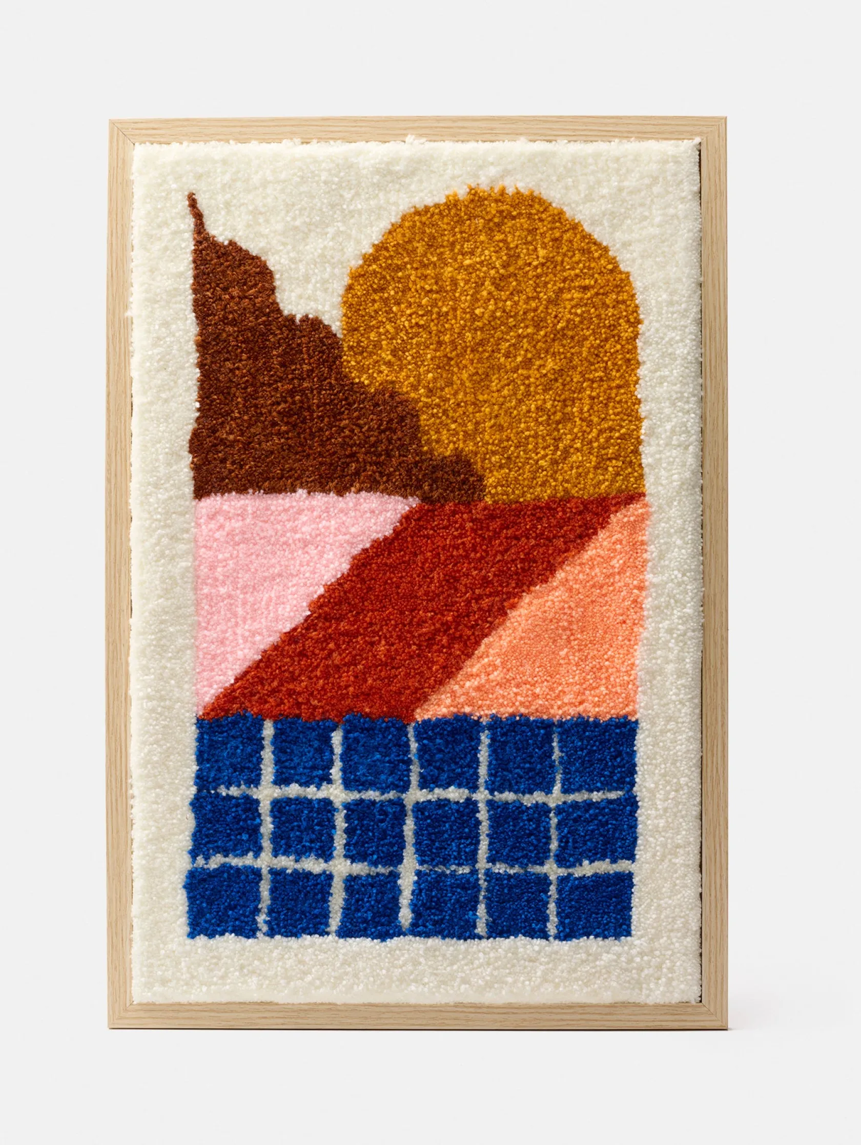 Dieses Kunstwerk ist eine geometrische Tufting-Komposition. Inspiriert von ruhigen Landschaften und Poolkacheln, ist es eine bezaubernde Einladung zum Reisen und Entspannen. Die Linien und Formen fangen die beruhigende Essenz ferner Horizonte ein, während die sanften Töne die Ruhe eines sonnigen Tages am Wasser heraufbeschwören. Jeder Winkel und jede Farbe erzählt eine Geschichte des Friedens und entführt Sie in eine Welt der Ruhe und Gelassenheit.