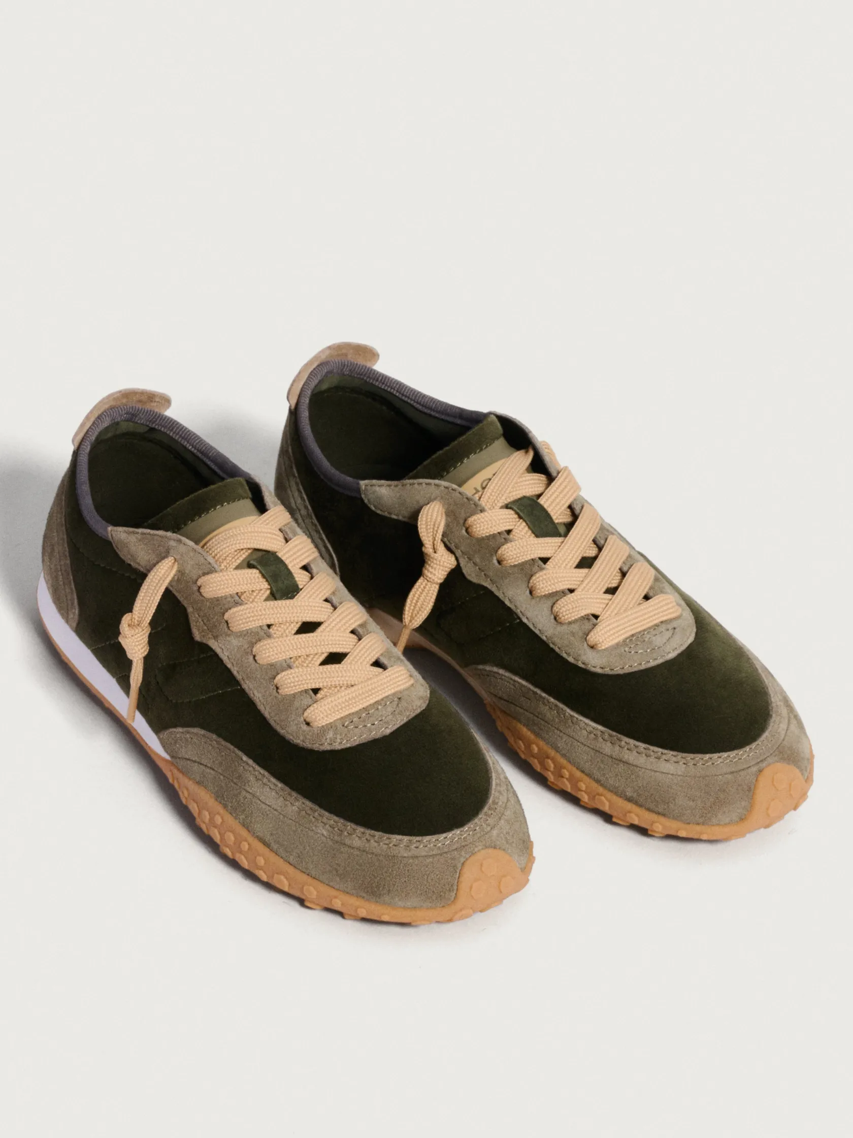 Die HAWK Sneaker aus der BIRD Kollektion fangen die Essenz von Herbst und Frühling mit ihrem Design ein. Mit einer Ästhetik, die die klassische sportliche Form mit einem Hauch von Raffinesse verbindet, zeichnen sie sich durch ihre klaren Linien und das flache Profil aus. Das Gleichgewicht zwischen Leder und Stoff sorgt für besonderen Komfort. Die Waldgrüntöne und Wildlederdetails harmonieren mit der gelben Gummisohle, die subtil auf Fußballschuhe verweist, jedoch mit einem modernen Twist. Ideal, um sie mit einem Jeansrock oder weiten Hosen zu kombinieren.