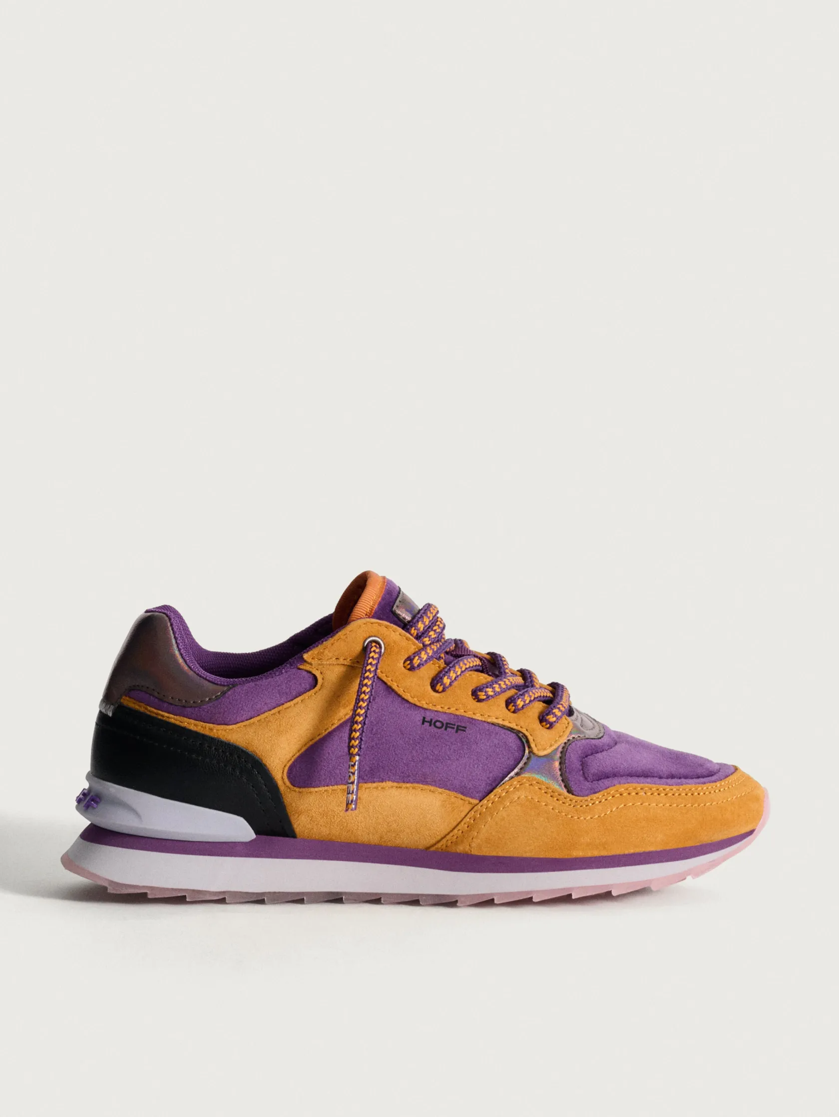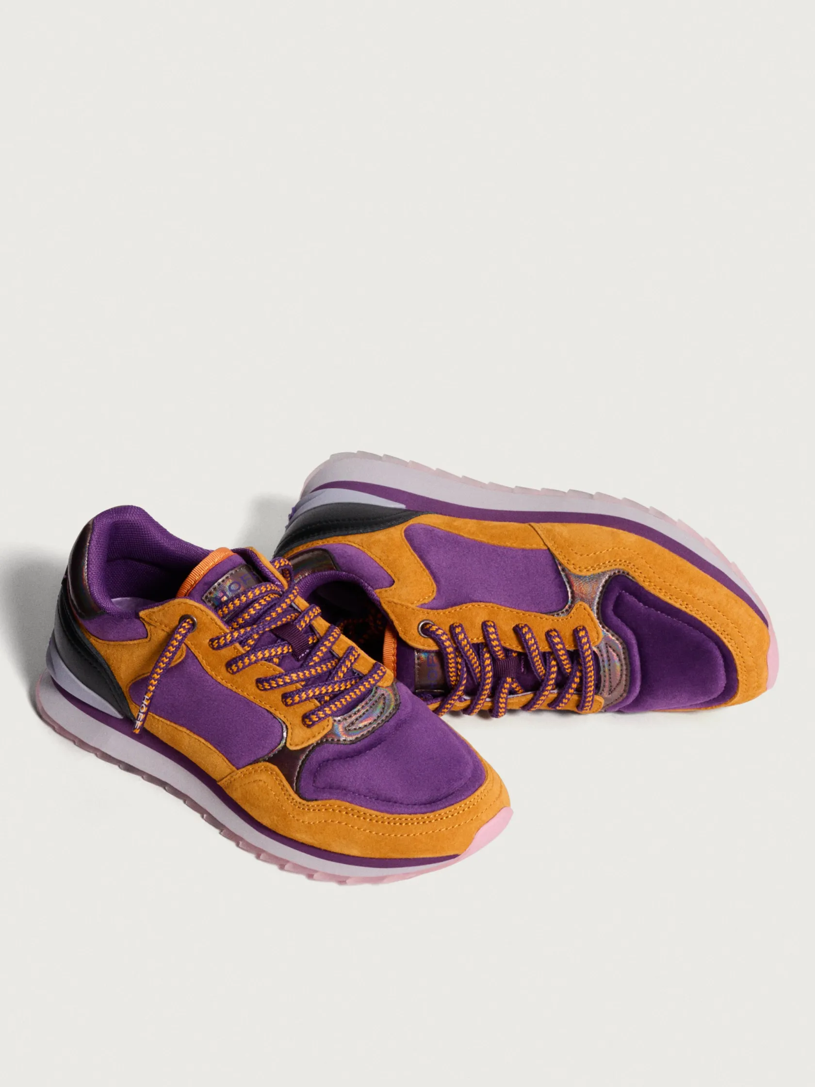 Einzigartigkeit und Originalität definieren die Modena-Sneaker. Mit einer Kombination aus Rauleder in Orange- und Violetttönen, einem irisierenden Fersenteil und passenden Schnürsenkeln zeichnen sich diese Schuhe durch ihren einzigartigen Stil aus. Die Mischung aus Materialien wie Leder und Samt bietet eine unverwechselbare und raffinierte Ästhetik. Trage sie mit einem violetten Midikleid und minimalistischen Accessoires in Orange, um die Details der Schuhe hervorzuheben.
