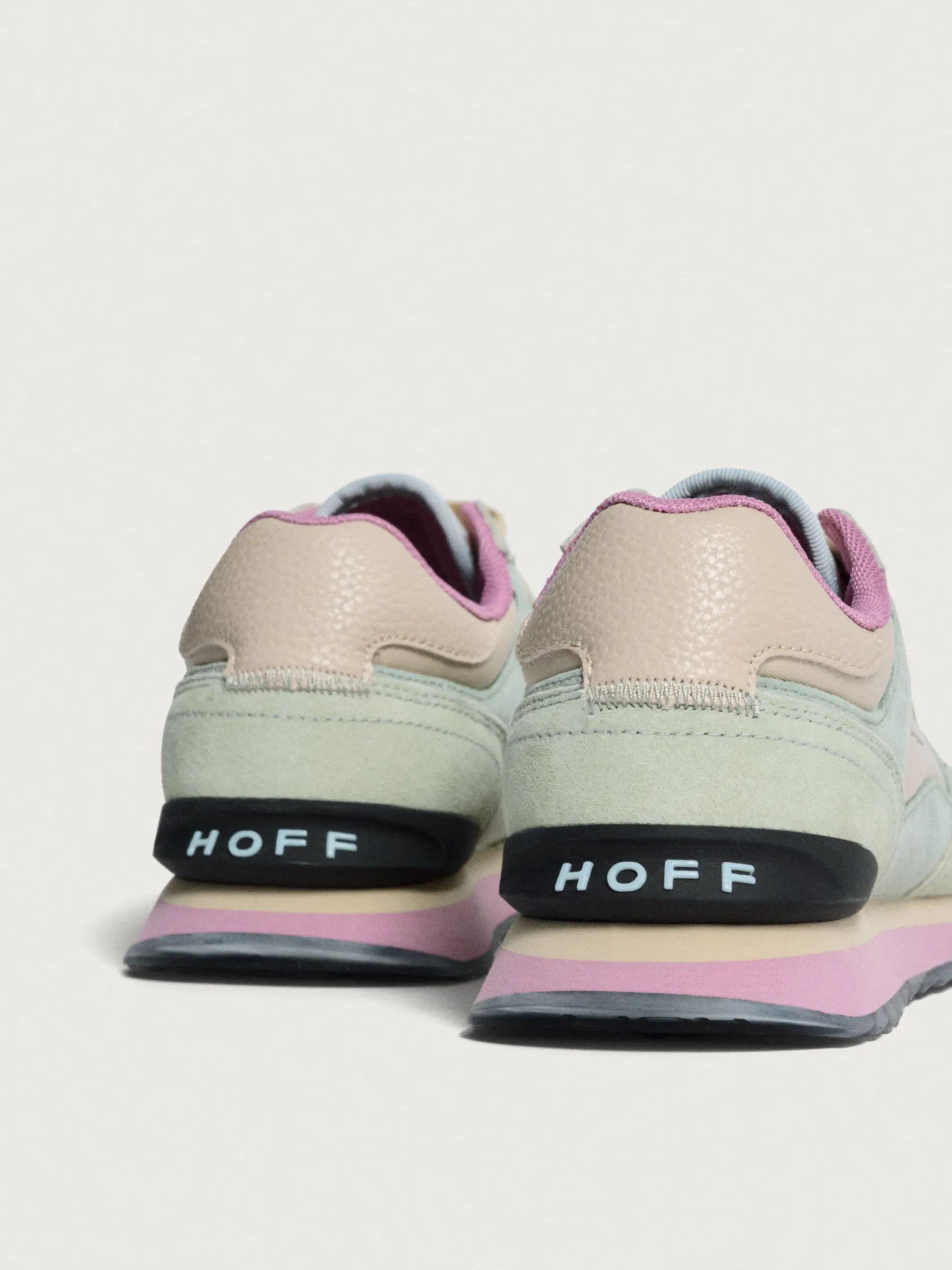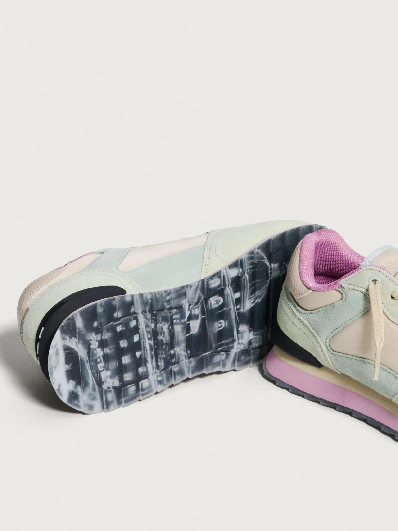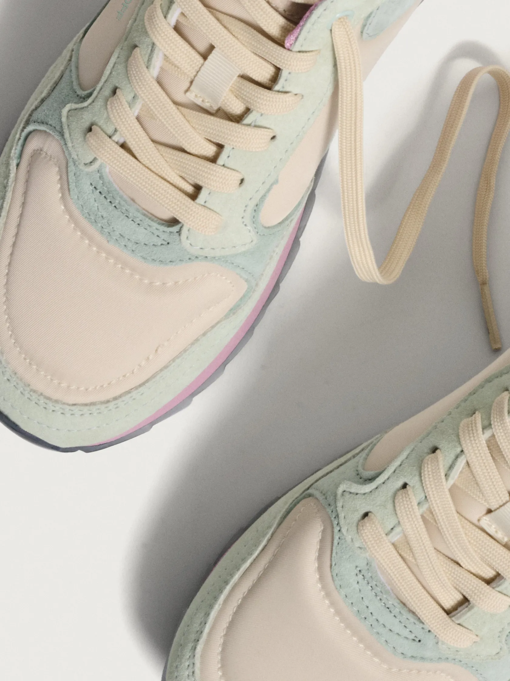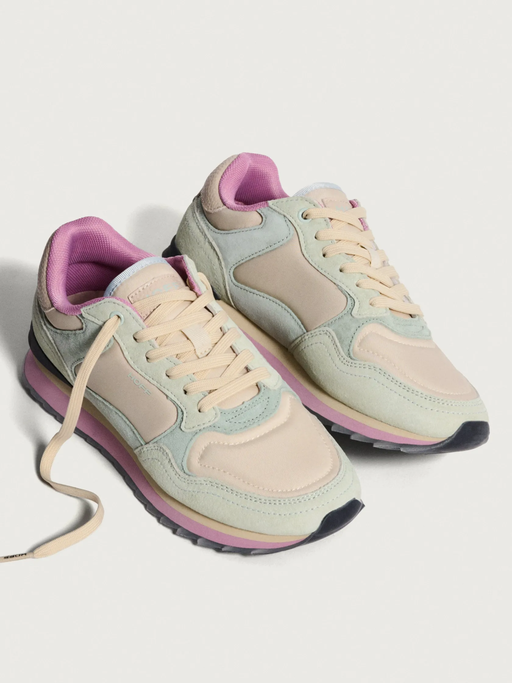 Salzburg-Sneaker sind authentisch. Mit Aquamarin-, Cremetönen und schwarzen Details zeichnen sich diese Sneaker durch ihre Originalität aus. Die Kombination aus Leder und Nylon bietet eine einzigartige Ästhetik, während die Sohle mit rosa und cremefarbener Linie einen Hauch von unverwechselbarem Stil verleiht. Diese Sneaker sind ideal für einen urbanen und modernen Look. Kombinieren Sie sie mit Jeans und einem Hemd für einen eleganten, lässigen Look.